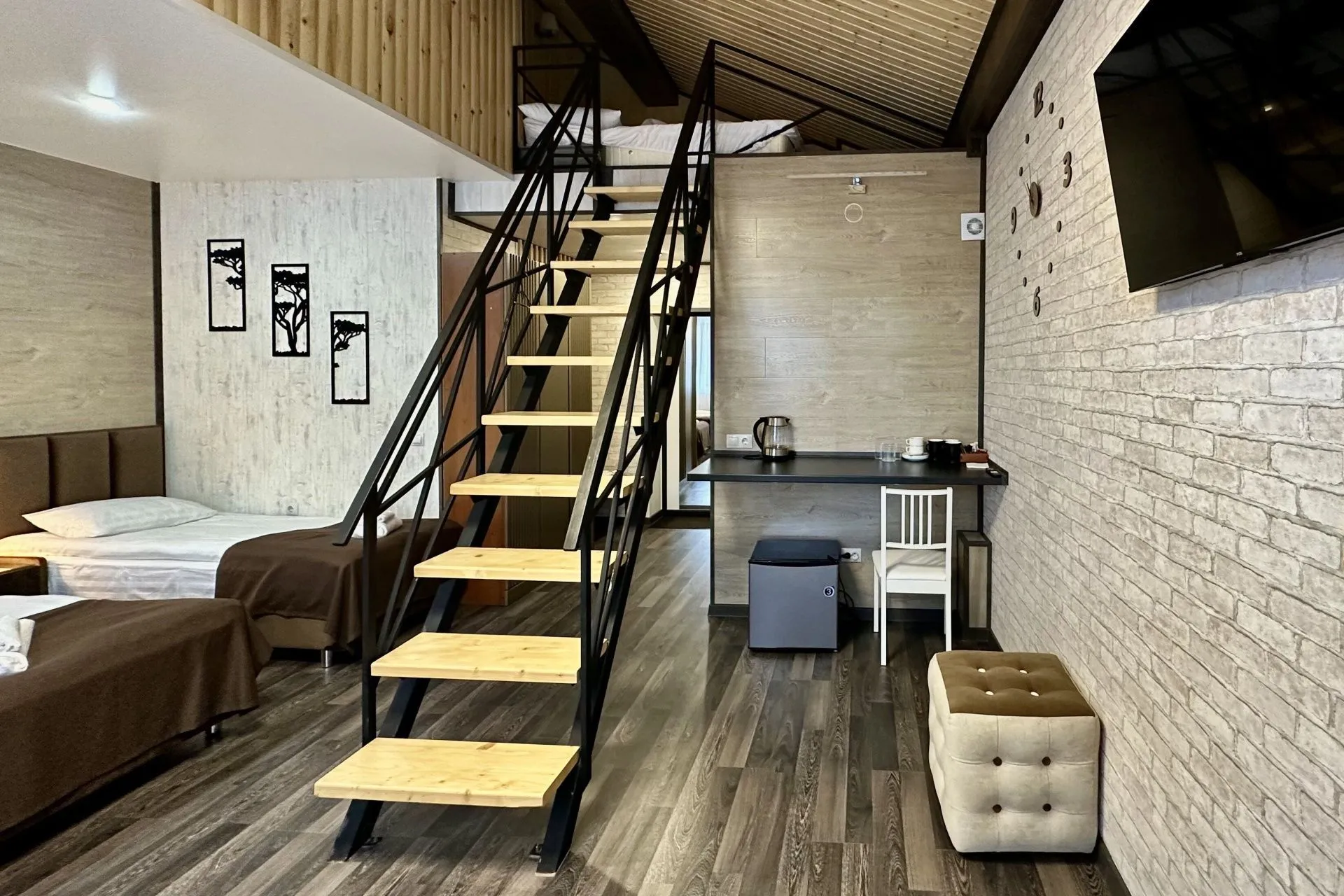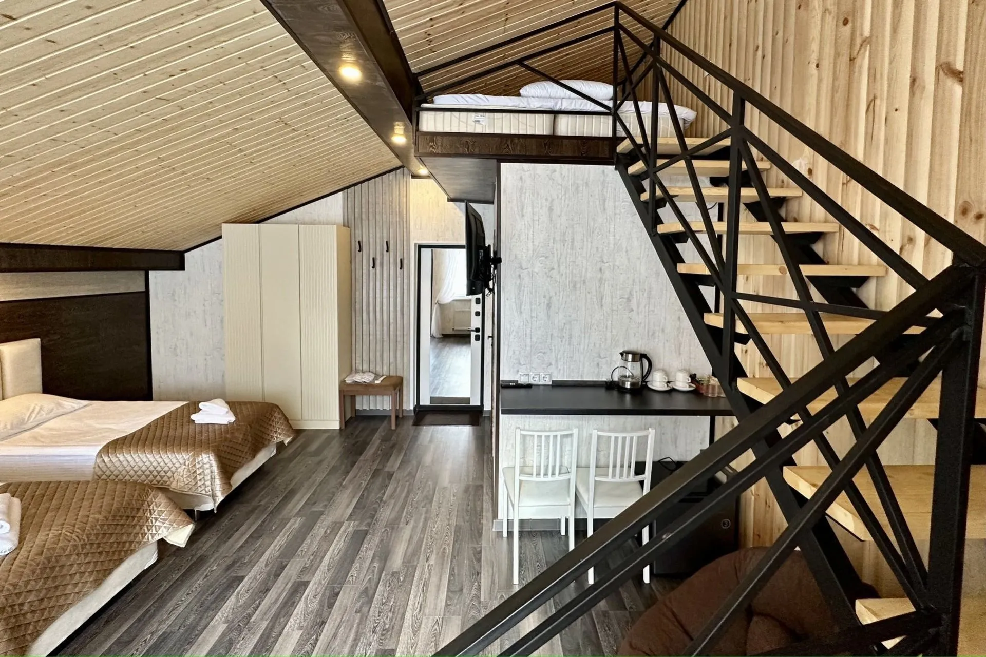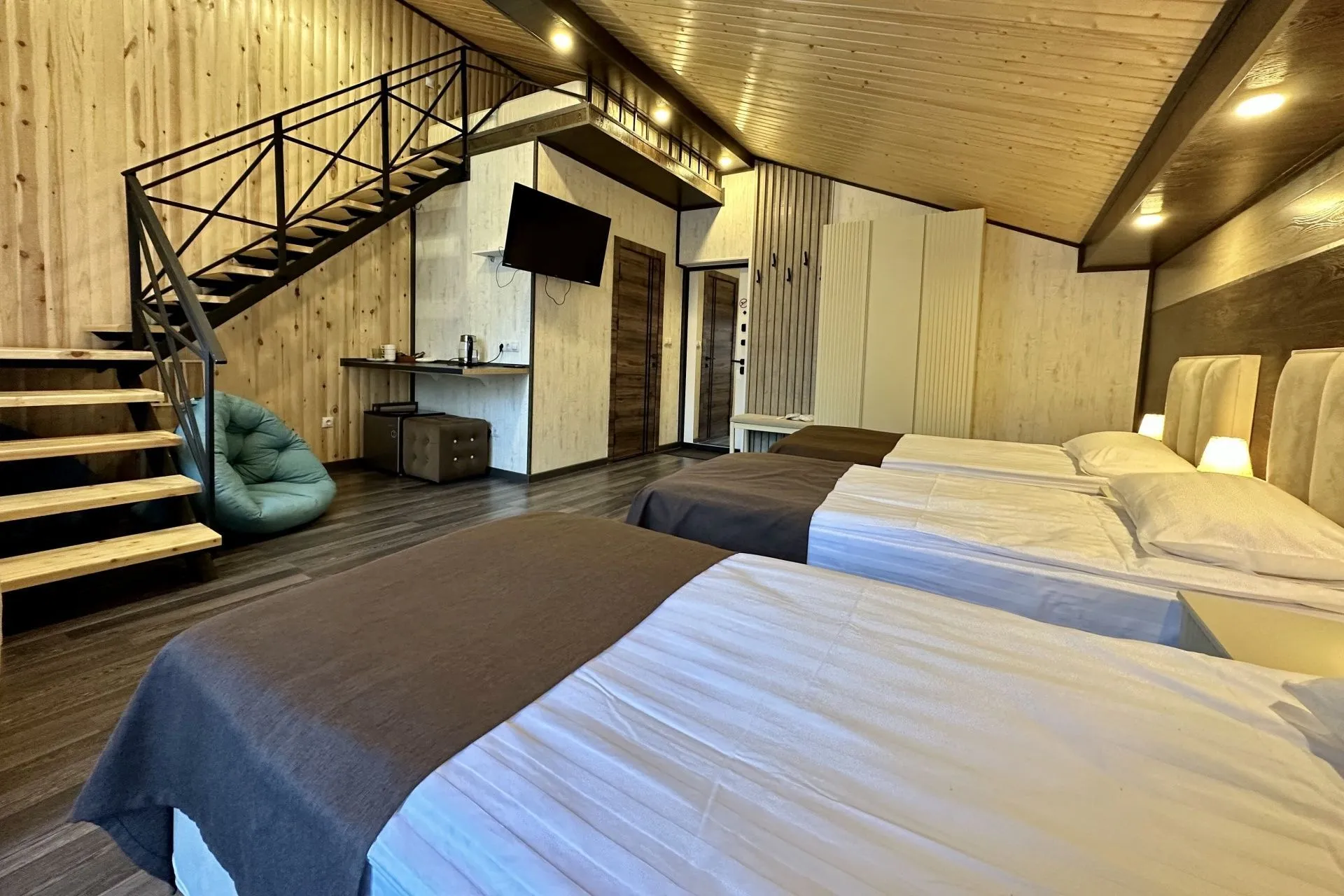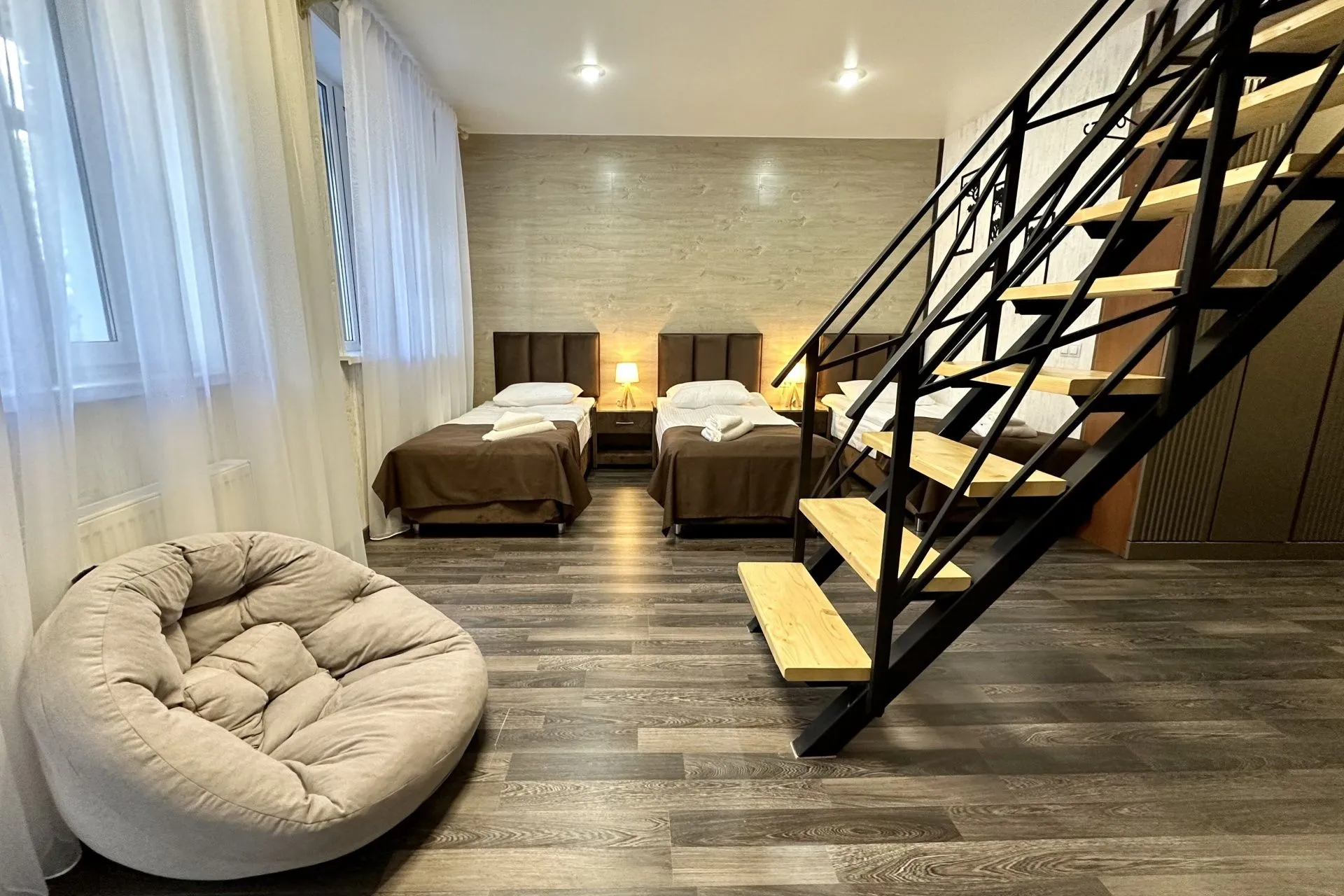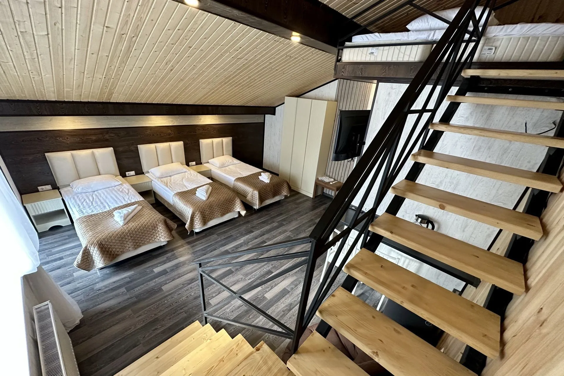 Spacious two-level rooms with stairs. An excellent option for a large family or group of friends.