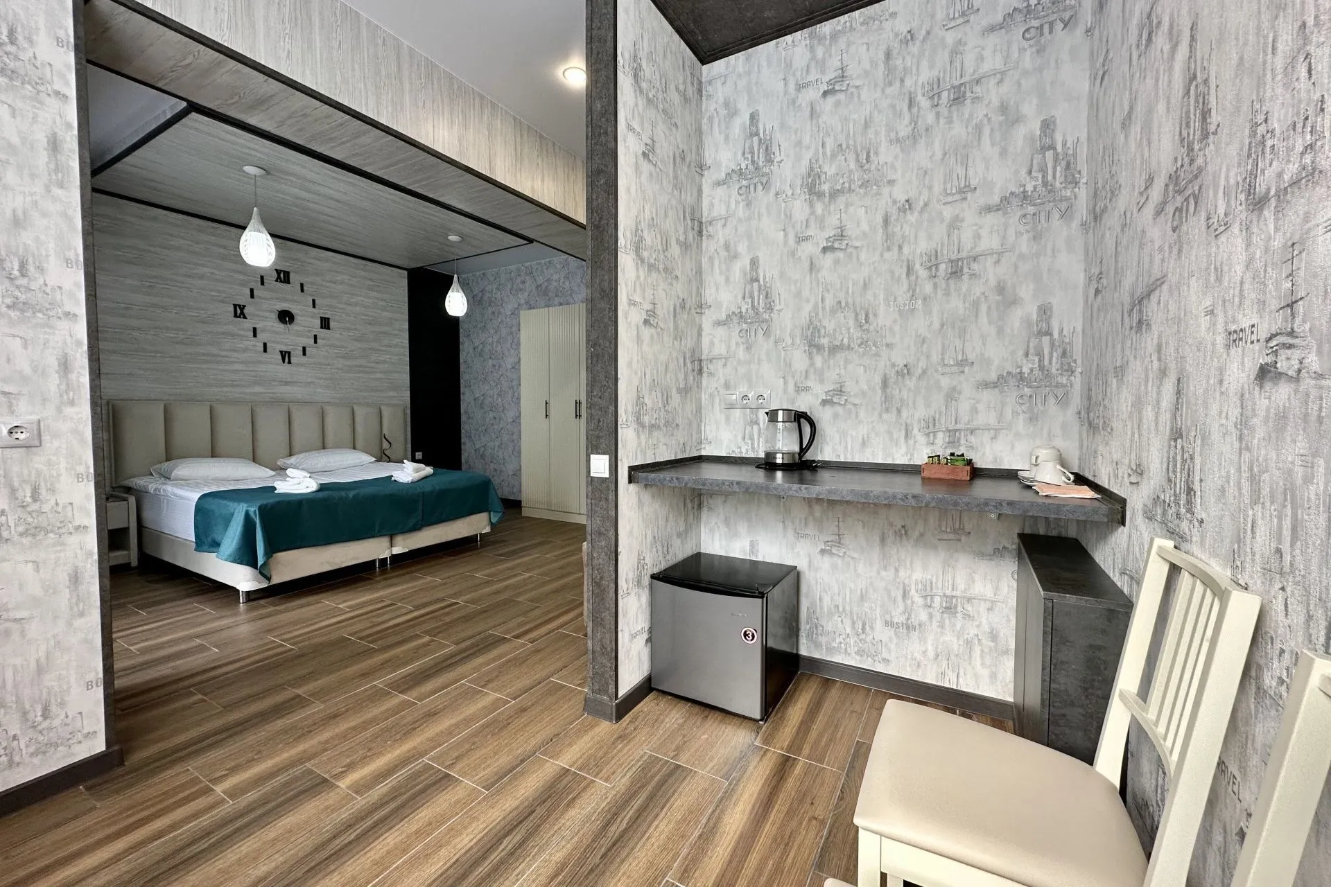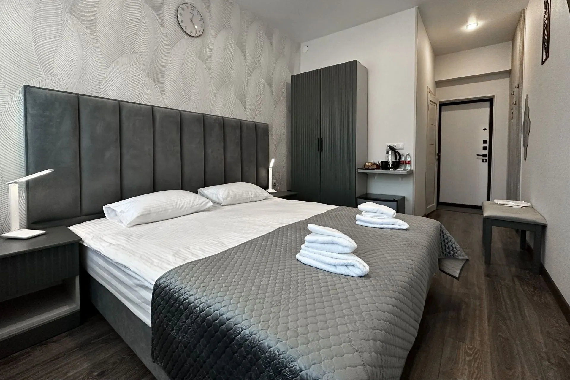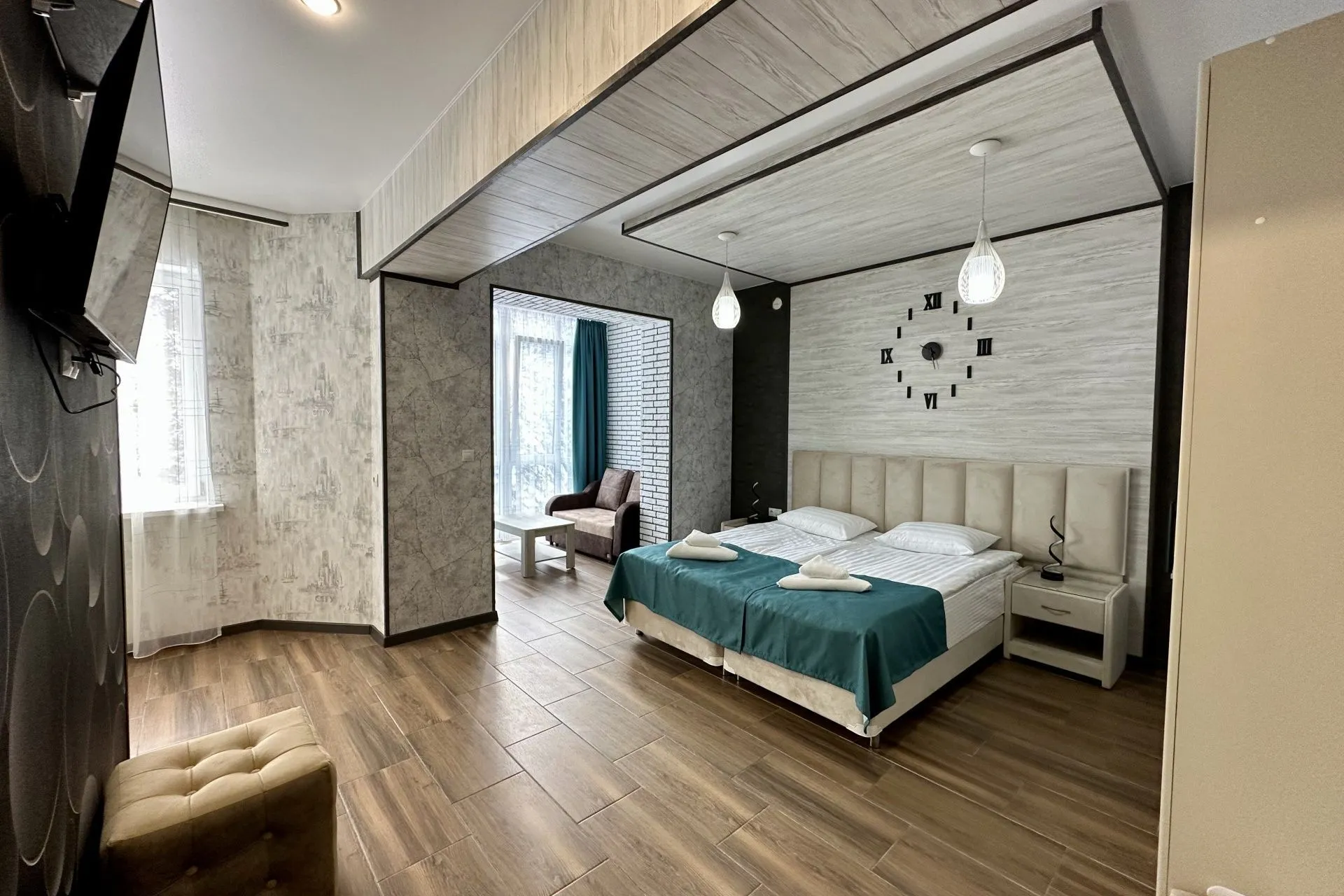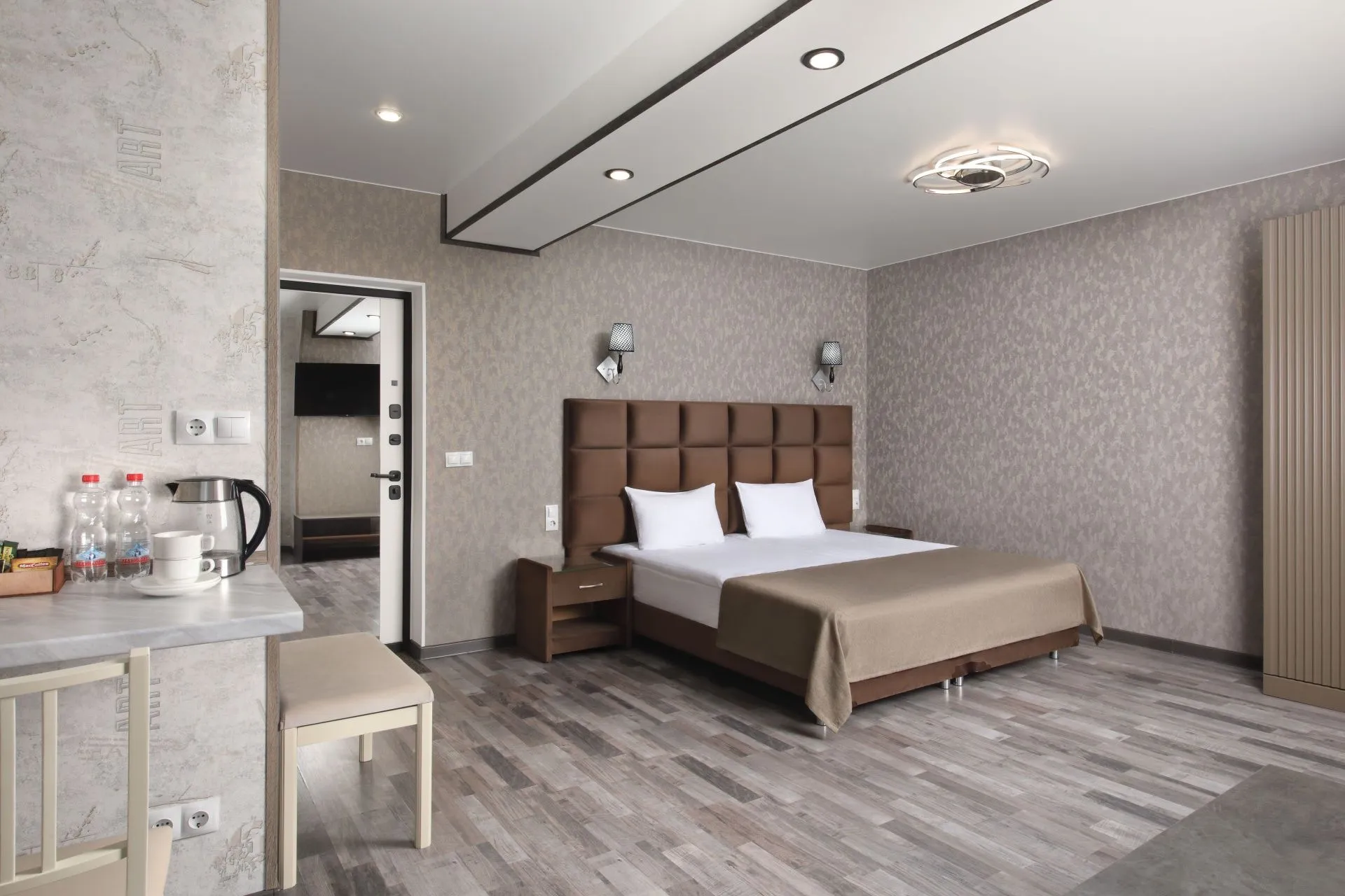 This modern, bright, and cozy one-room suite accommodates one or two guests. Light colors, panoramic windows, elegant design, and a private bathroom ensure your comfort.