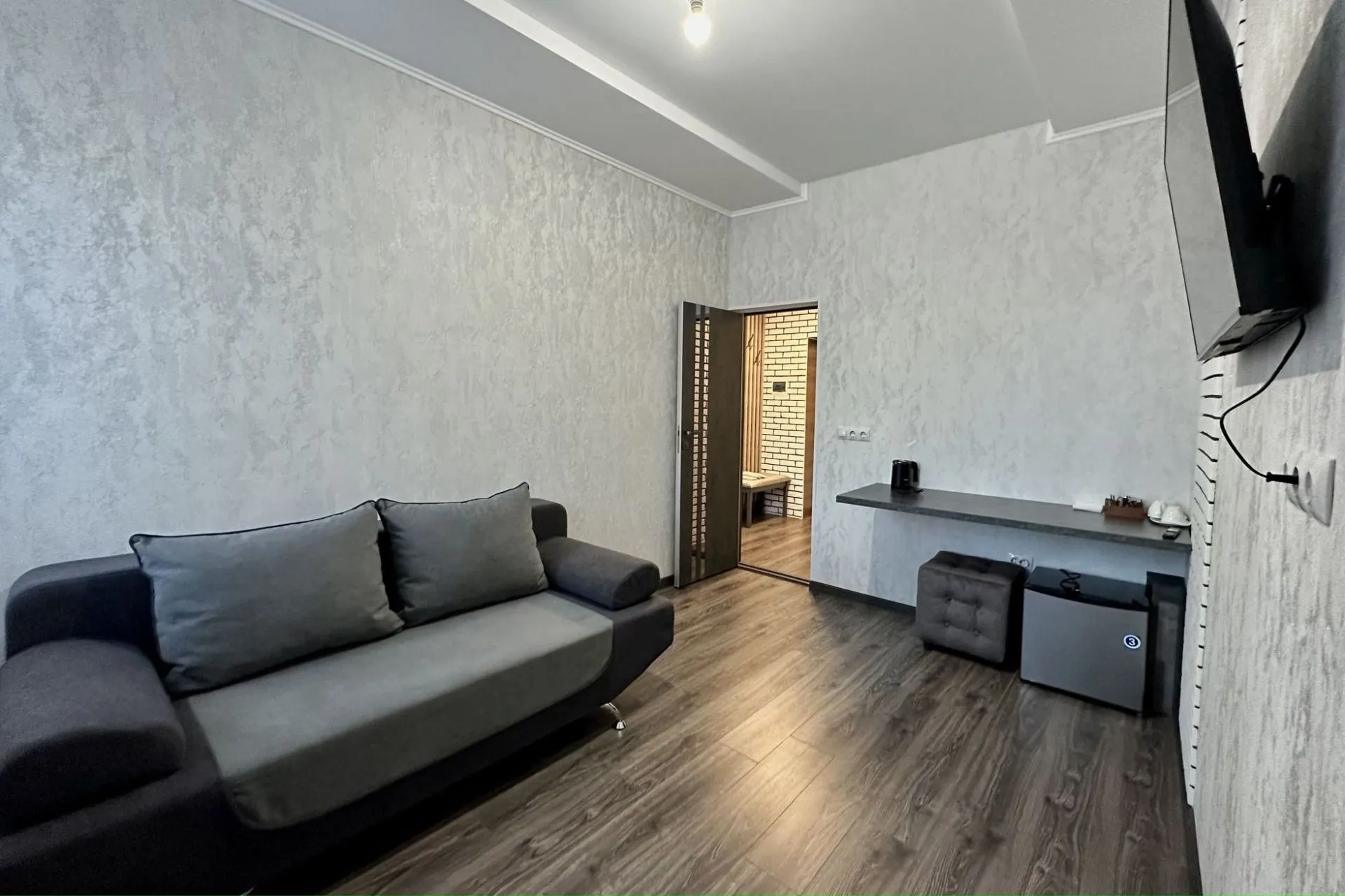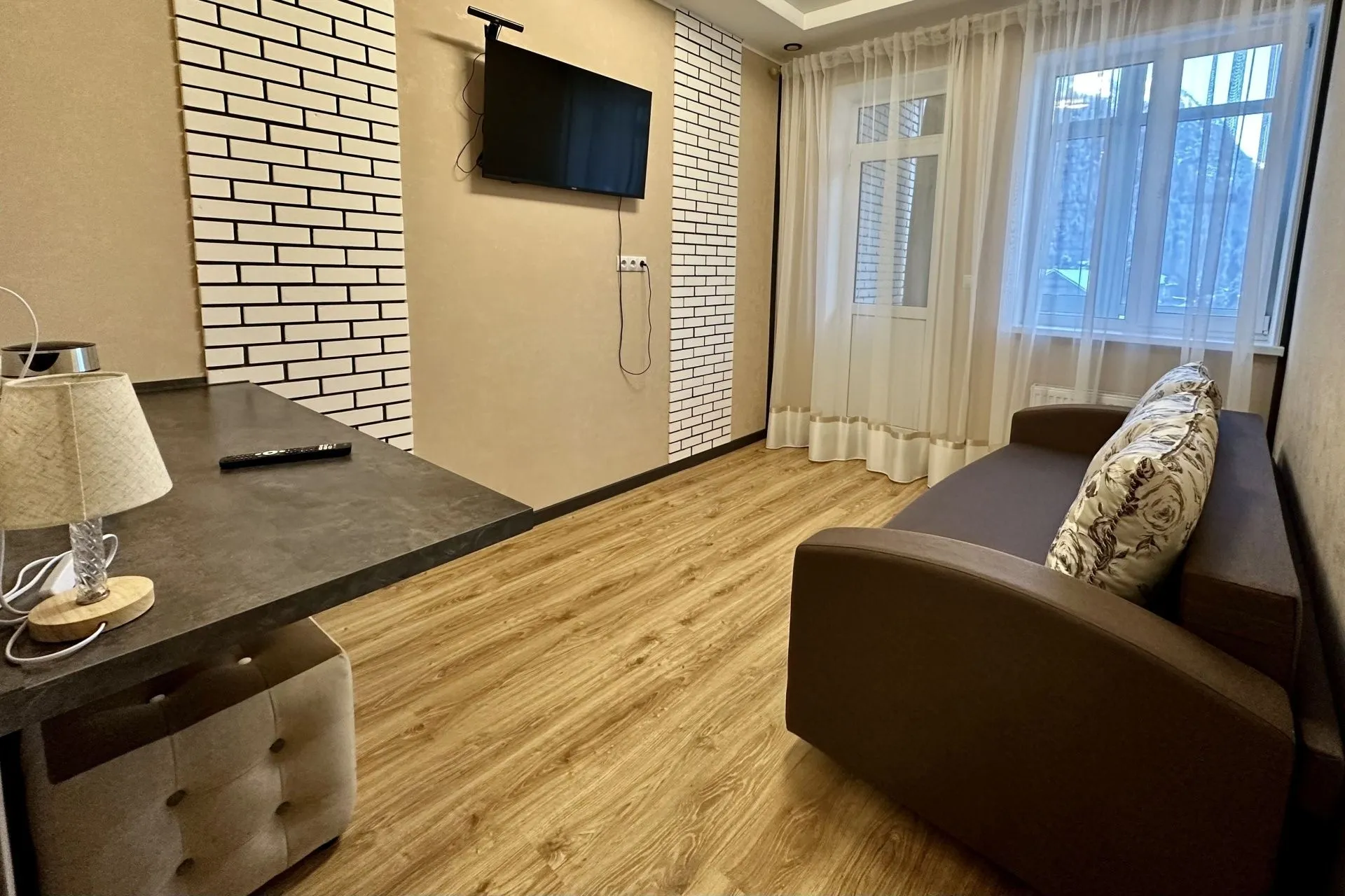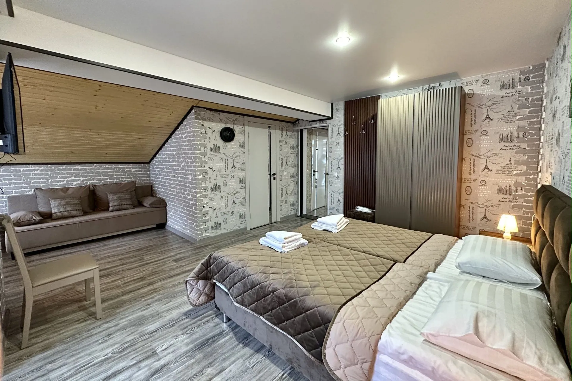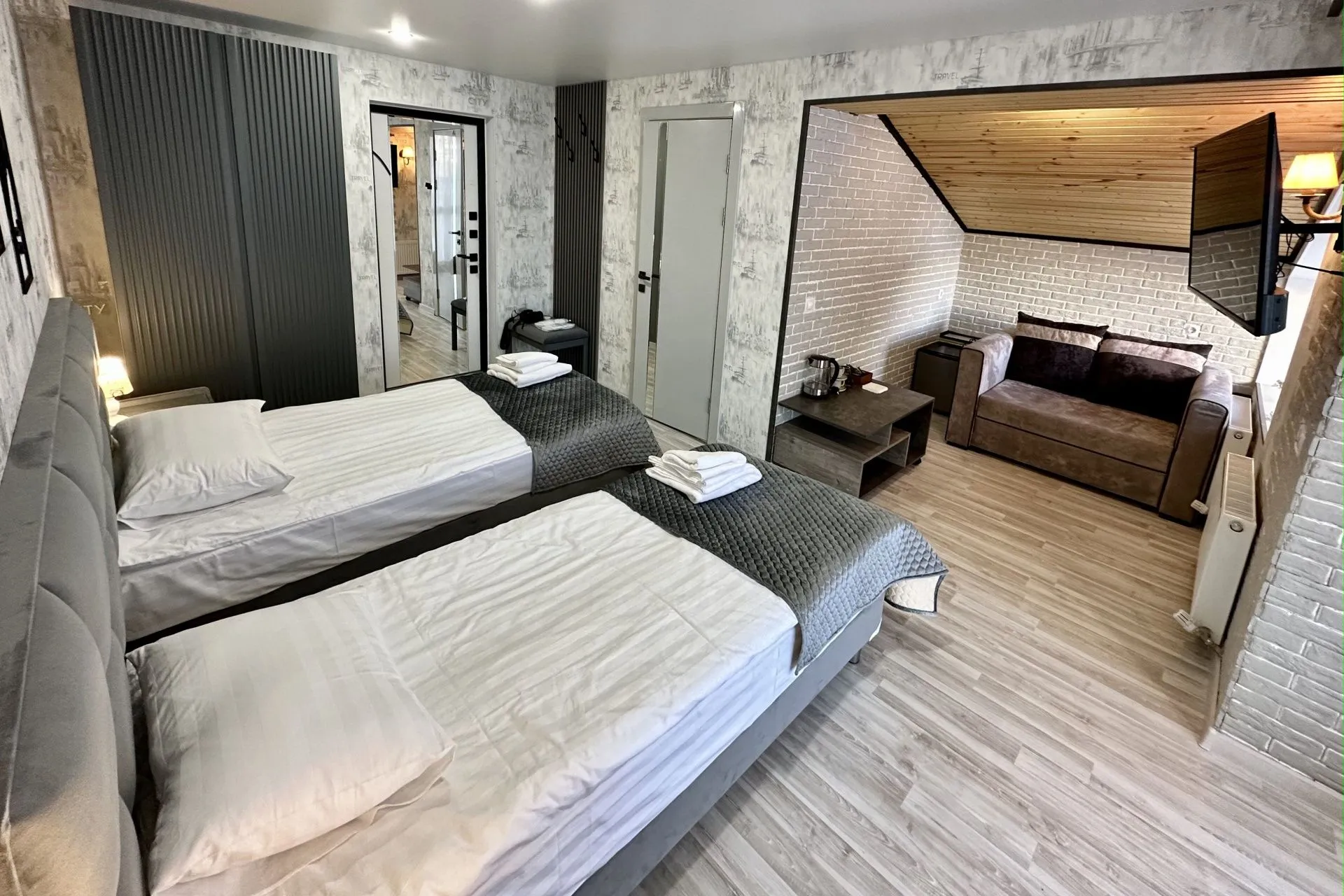 This modern, bright, and cozy one-room suite accommodates one or two guests. Light colors, panoramic windows, elegant design, and a private bathroom ensure your comfort.