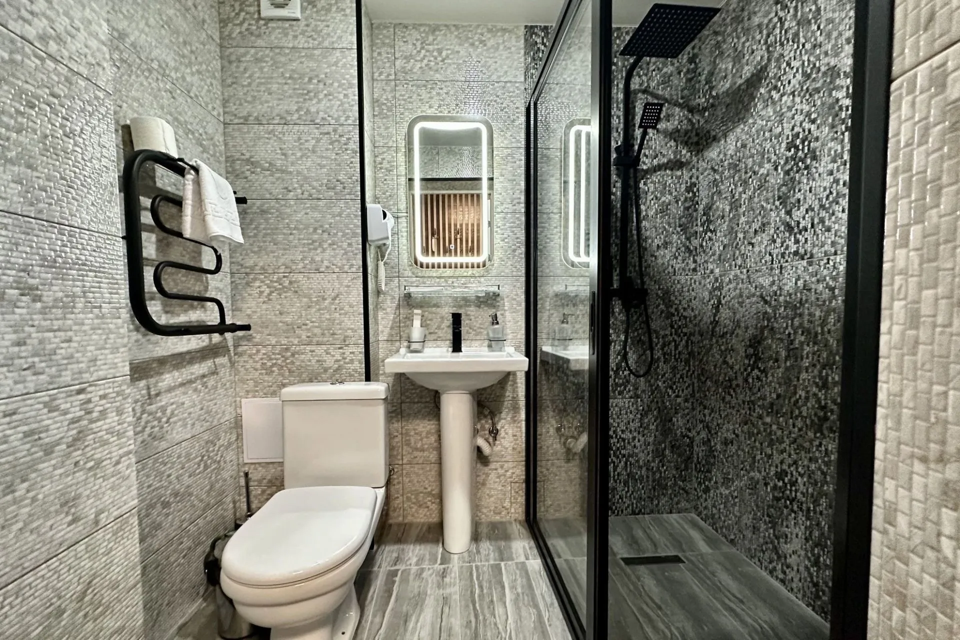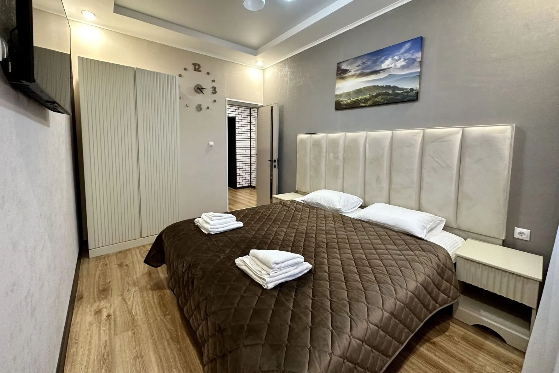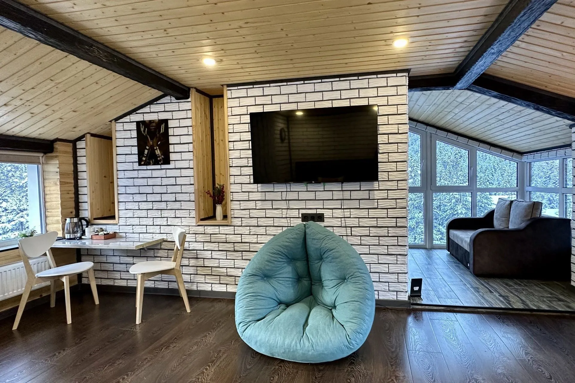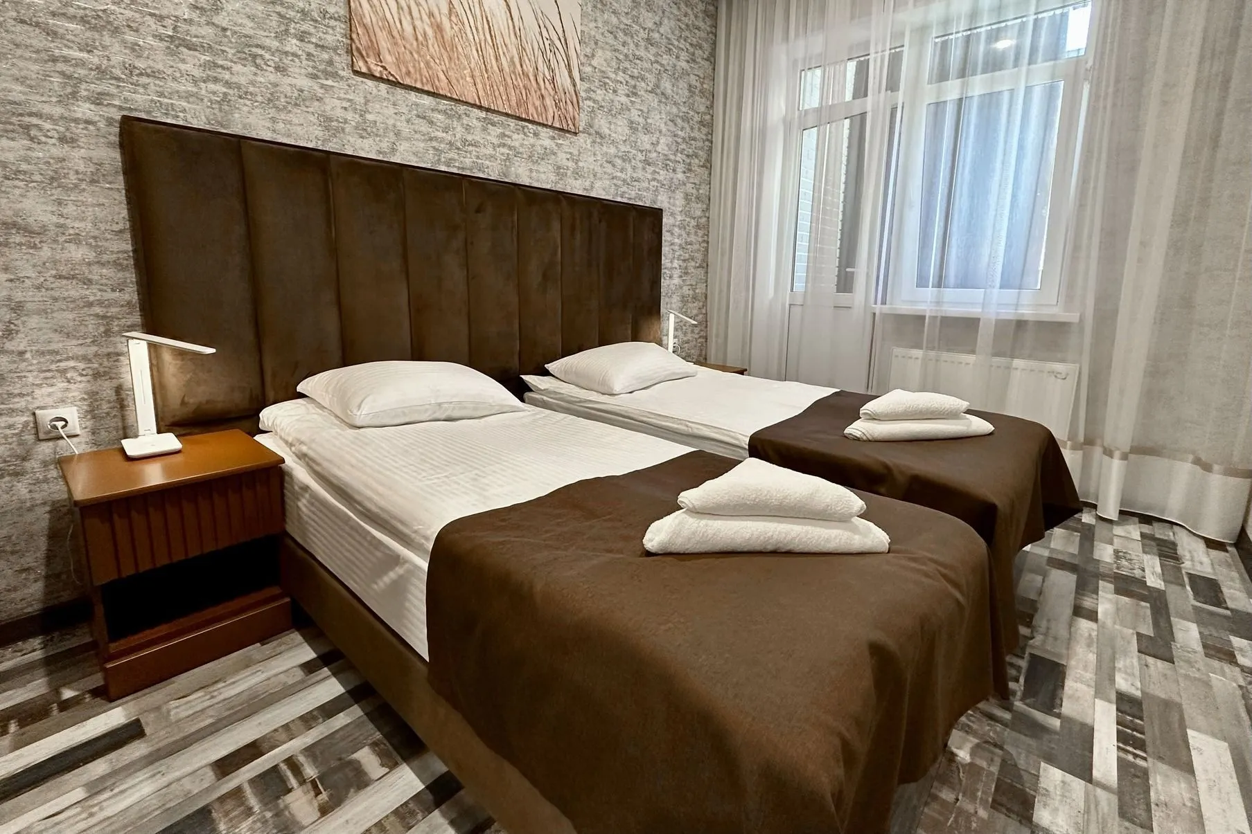 This modern, bright, and cozy one-room suite accommodates one or two guests. Light colors, panoramic windows, elegant design, and a private bathroom ensure your comfort.