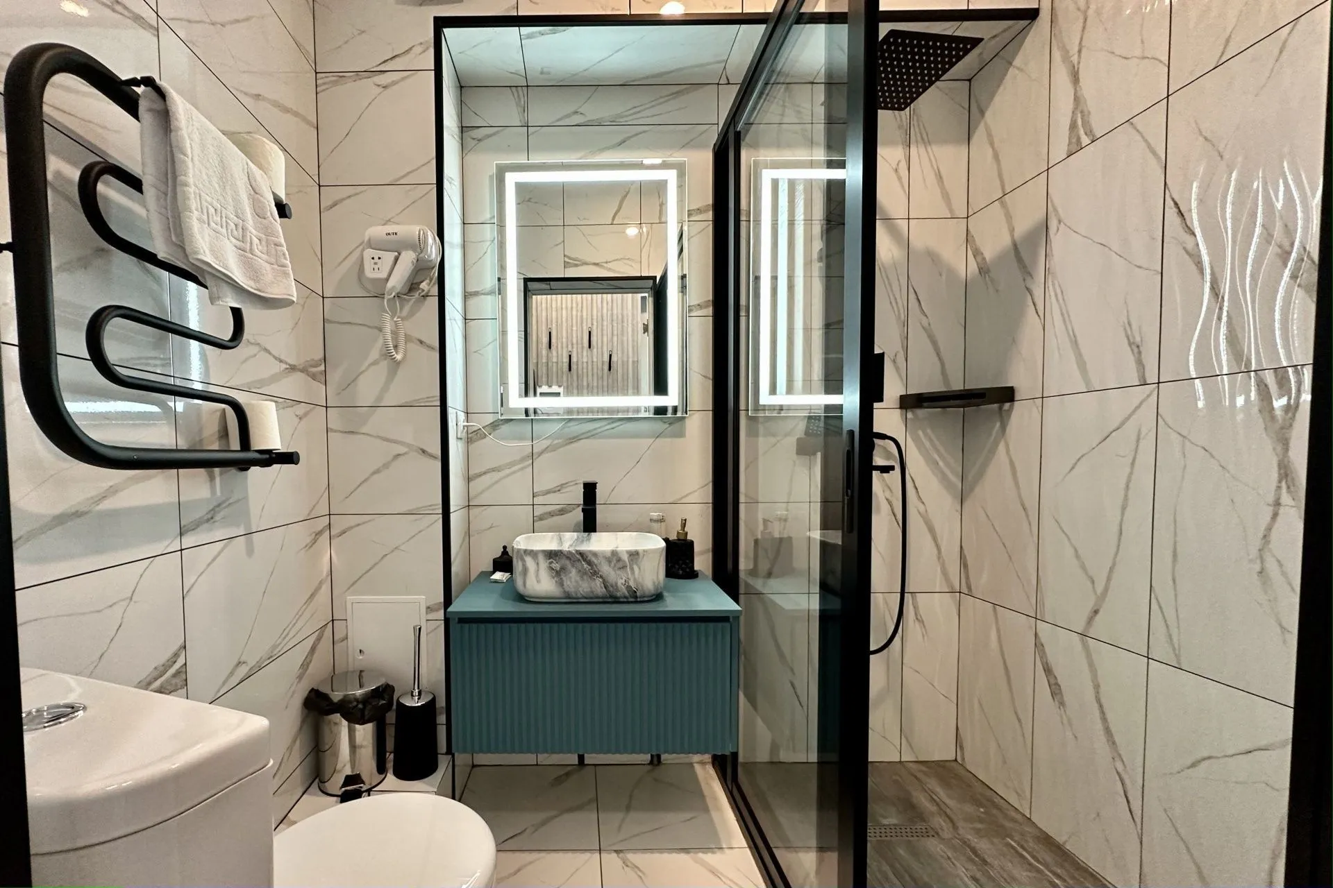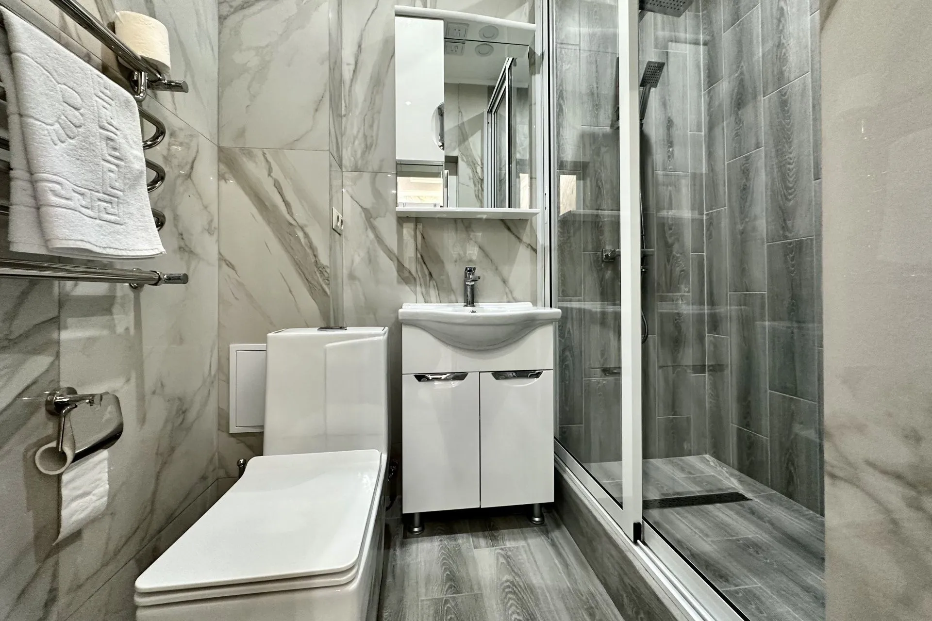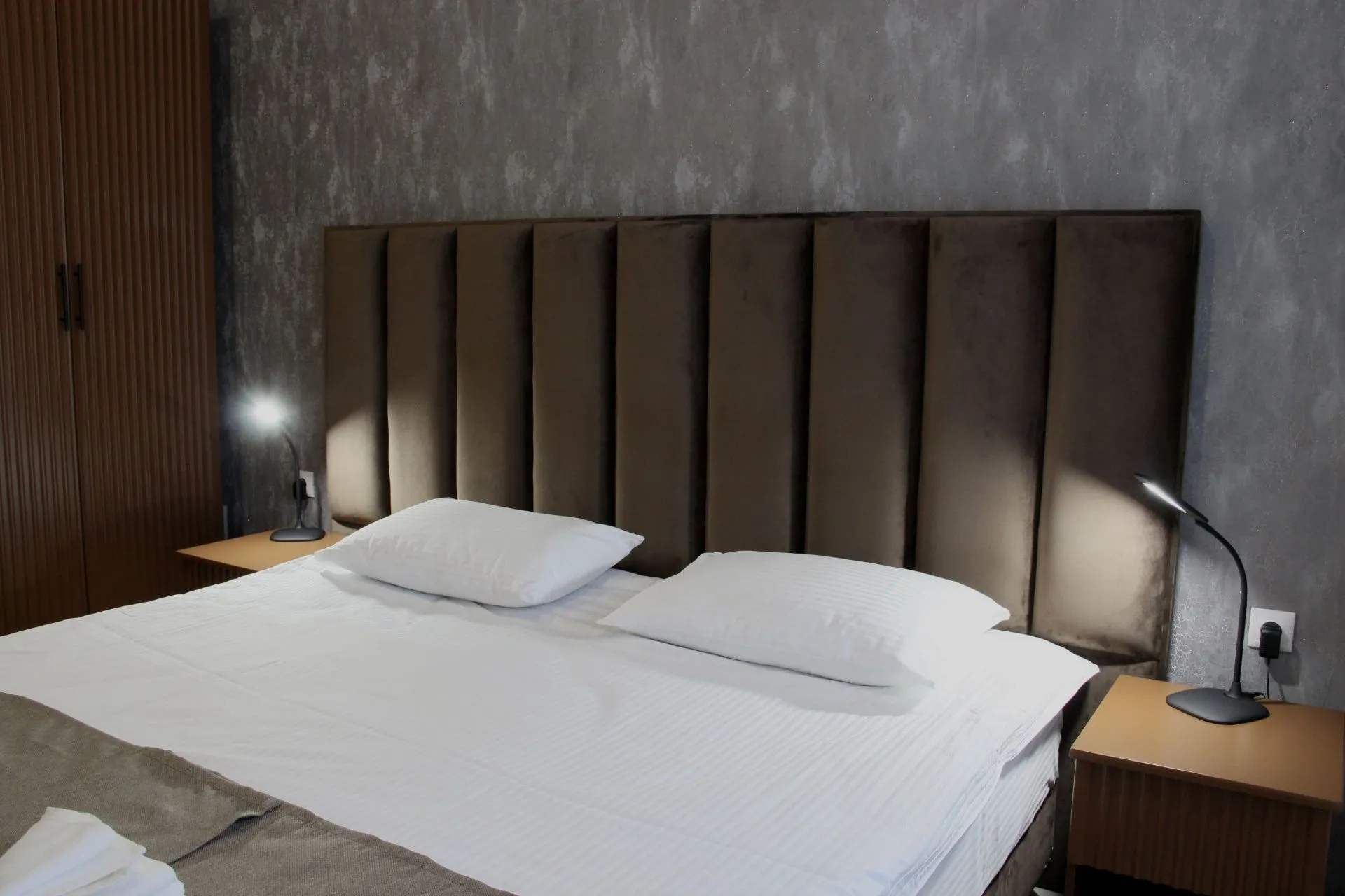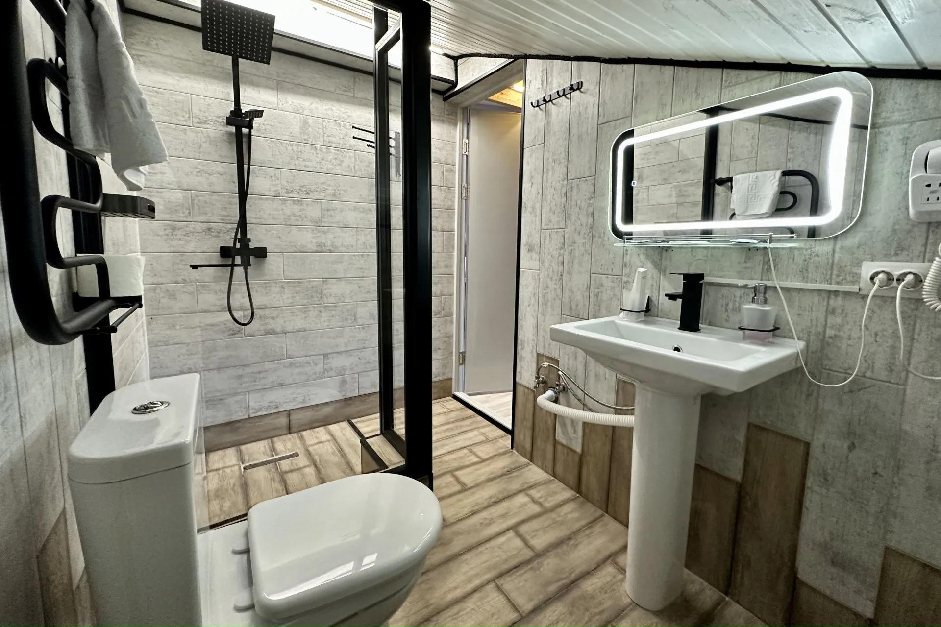 This modern, bright, and cozy one-room suite accommodates one or two guests. Light colors, panoramic windows, elegant design, and a private bathroom ensure your comfort.