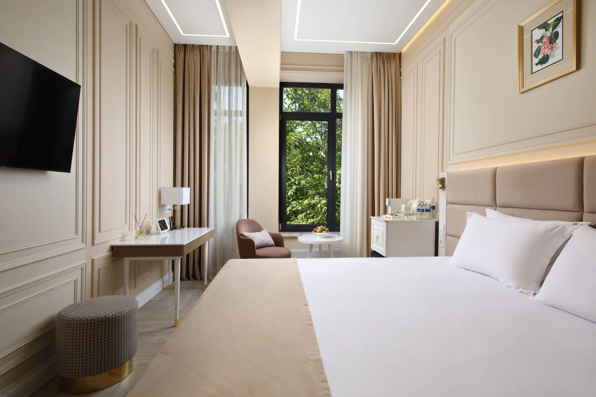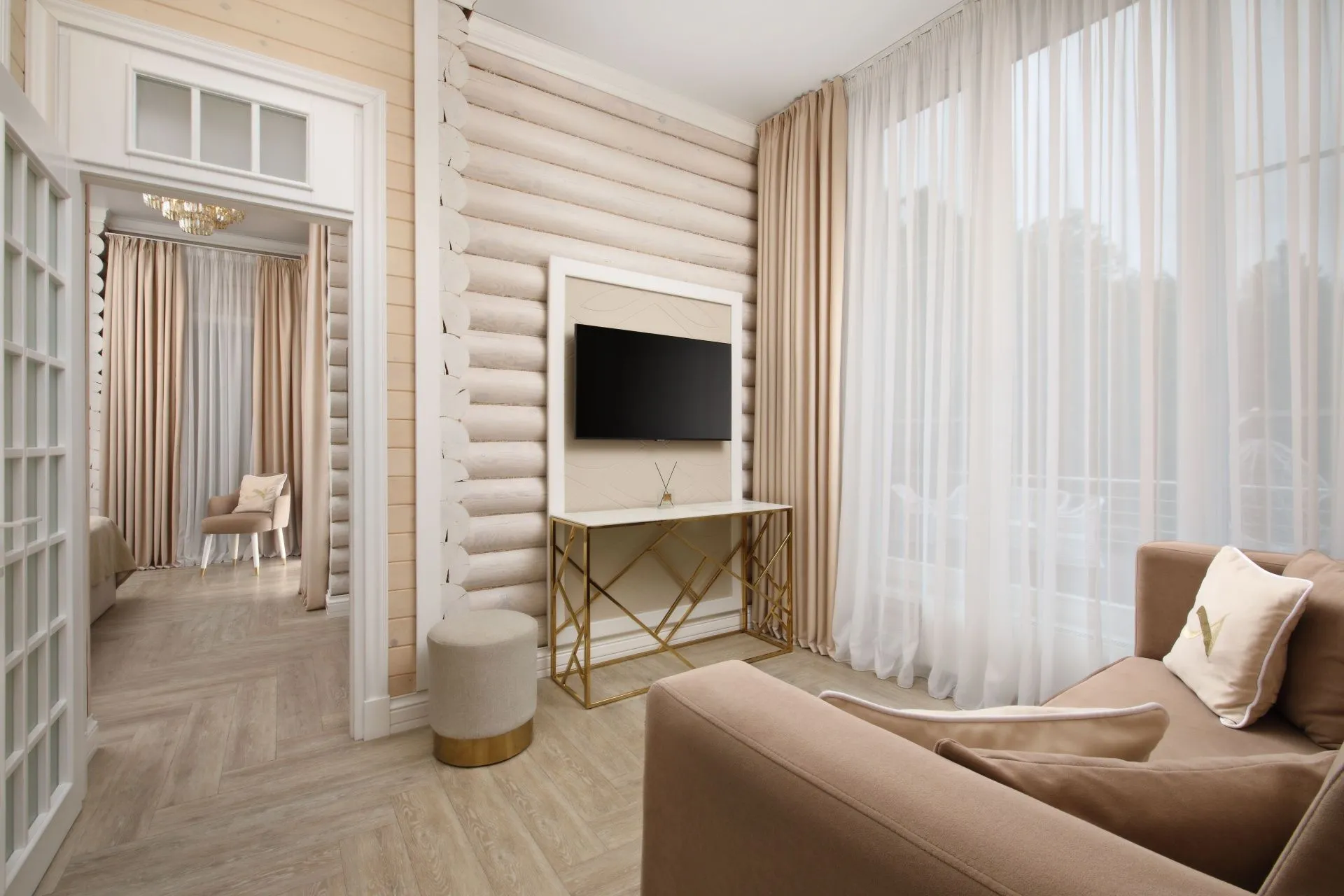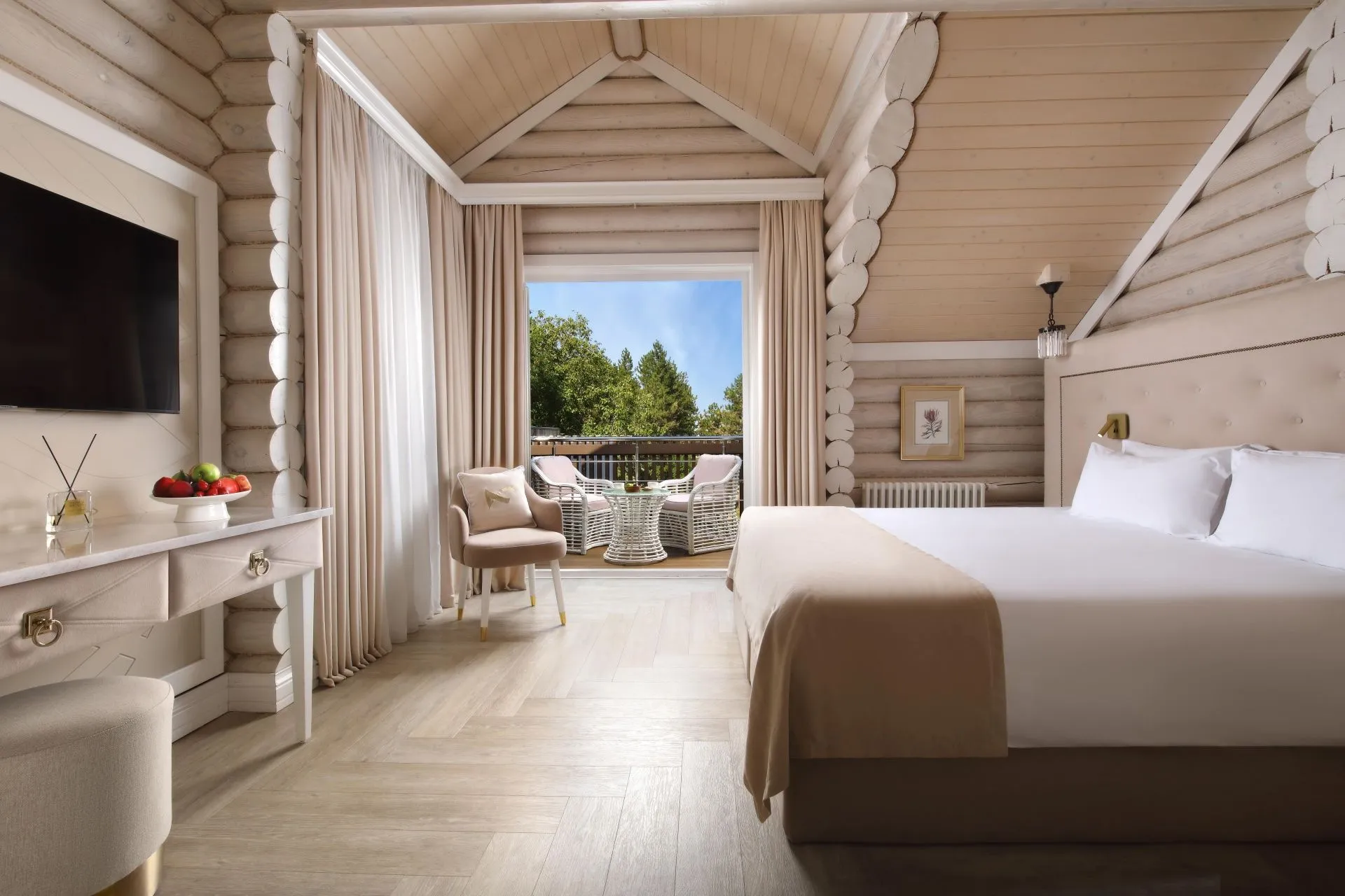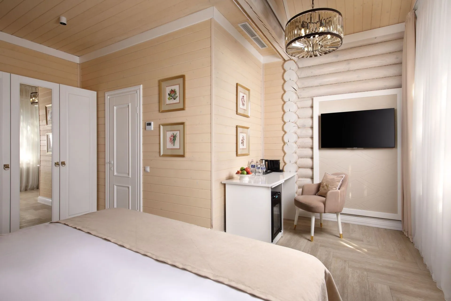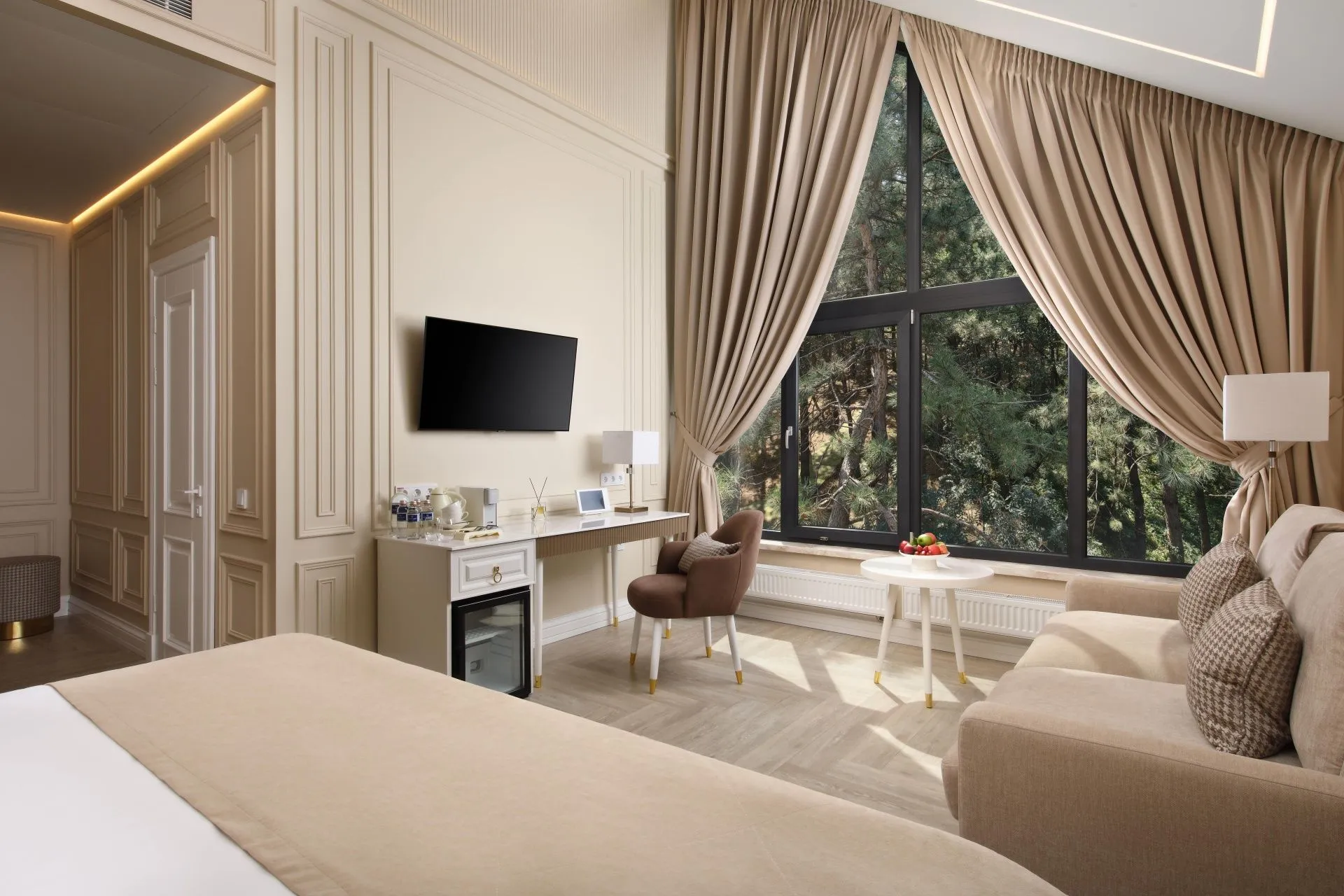 Ideal for both couples and family holidays. Spacious and comfortable 55 m2 suite with a separate bedroom, spacious living room and two bathrooms. The panoramic windows of the room offer views of the forest. The design of the room is made in neoclassical style and thought out to the smallest detail. Here you will find everything you need for a relaxing holiday.