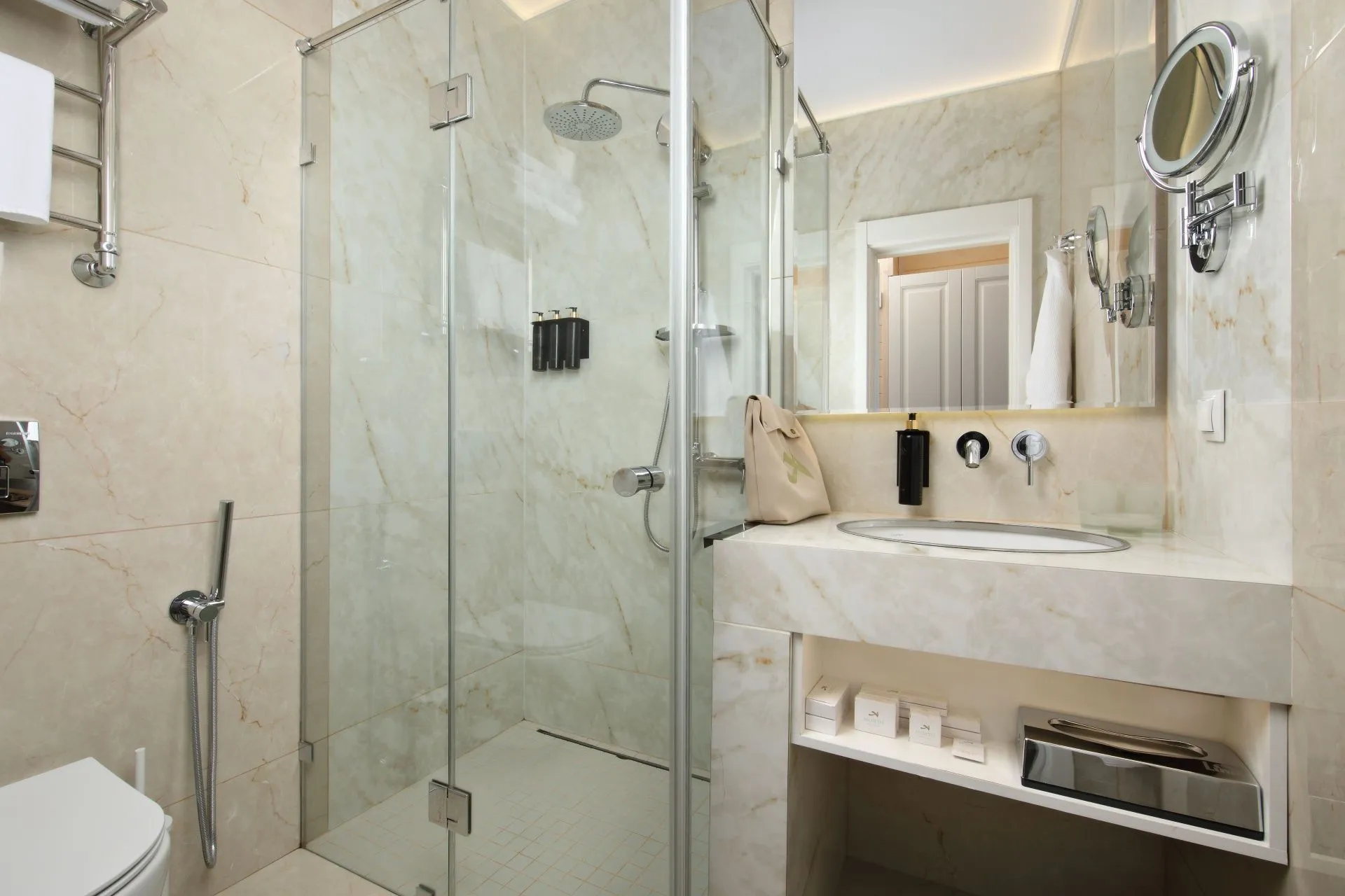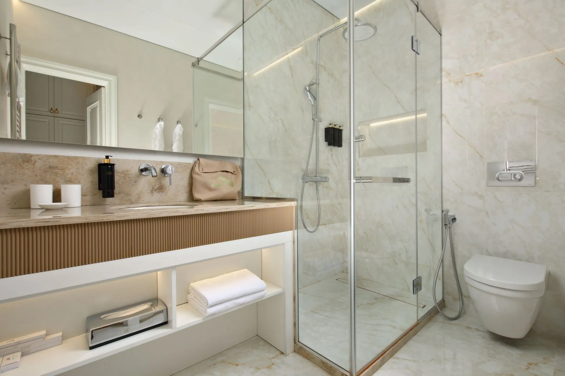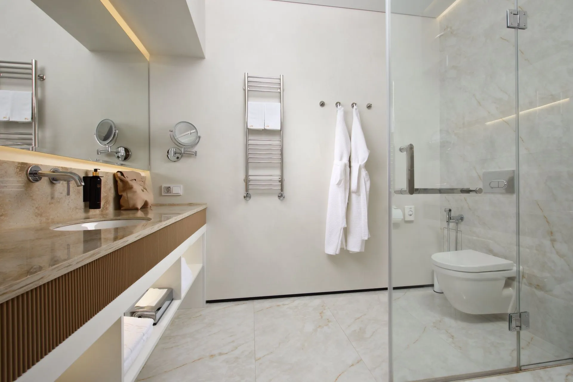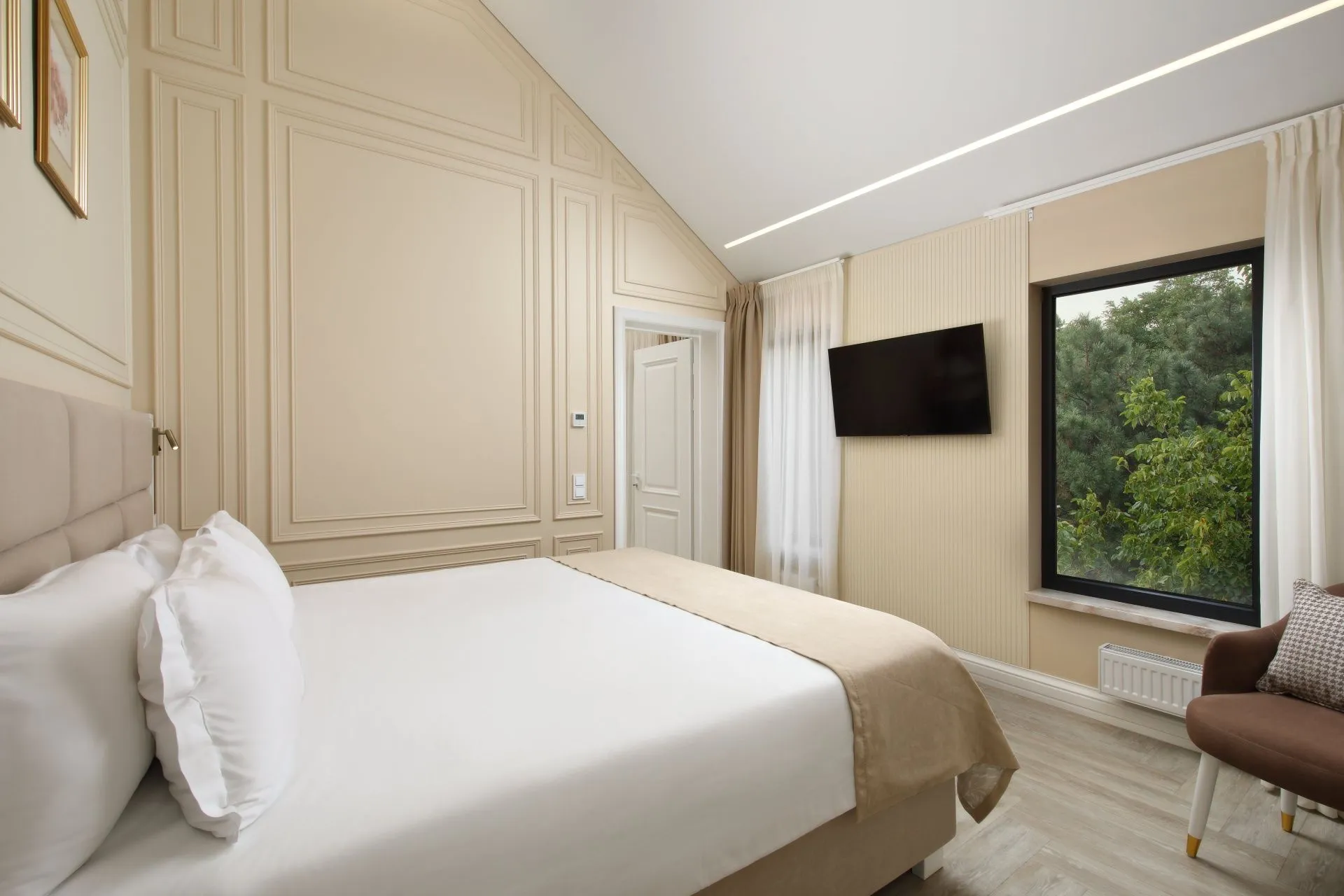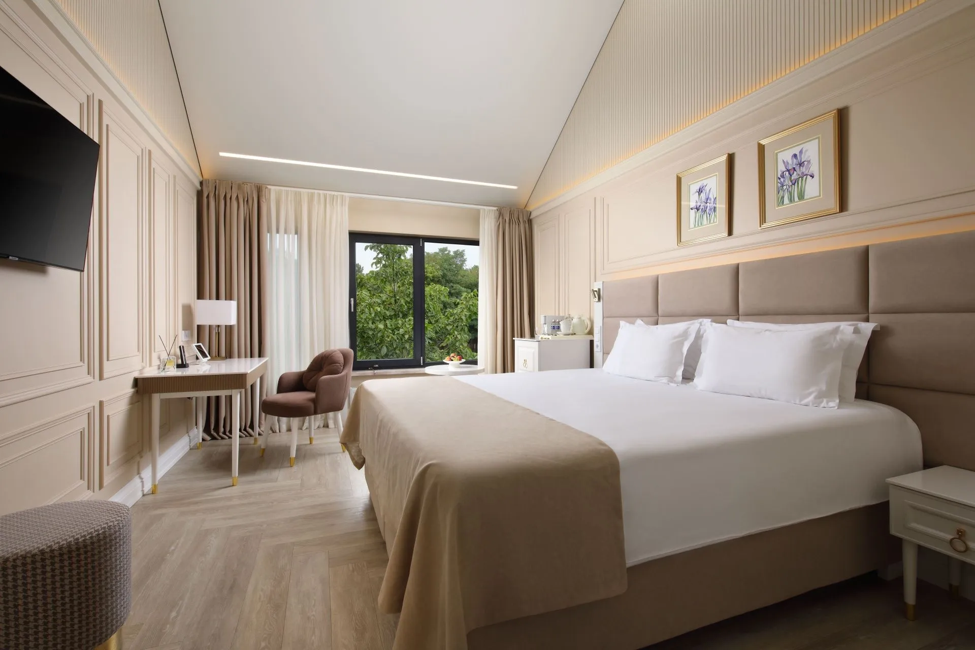 Ideal for both couples and family holidays. Spacious and comfortable 55 m2 suite with a separate bedroom, spacious living room and two bathrooms. The panoramic windows of the room offer views of the forest. The design of the room is made in neoclassical style and thought out to the smallest detail. Here you will find everything you need for a relaxing holiday.