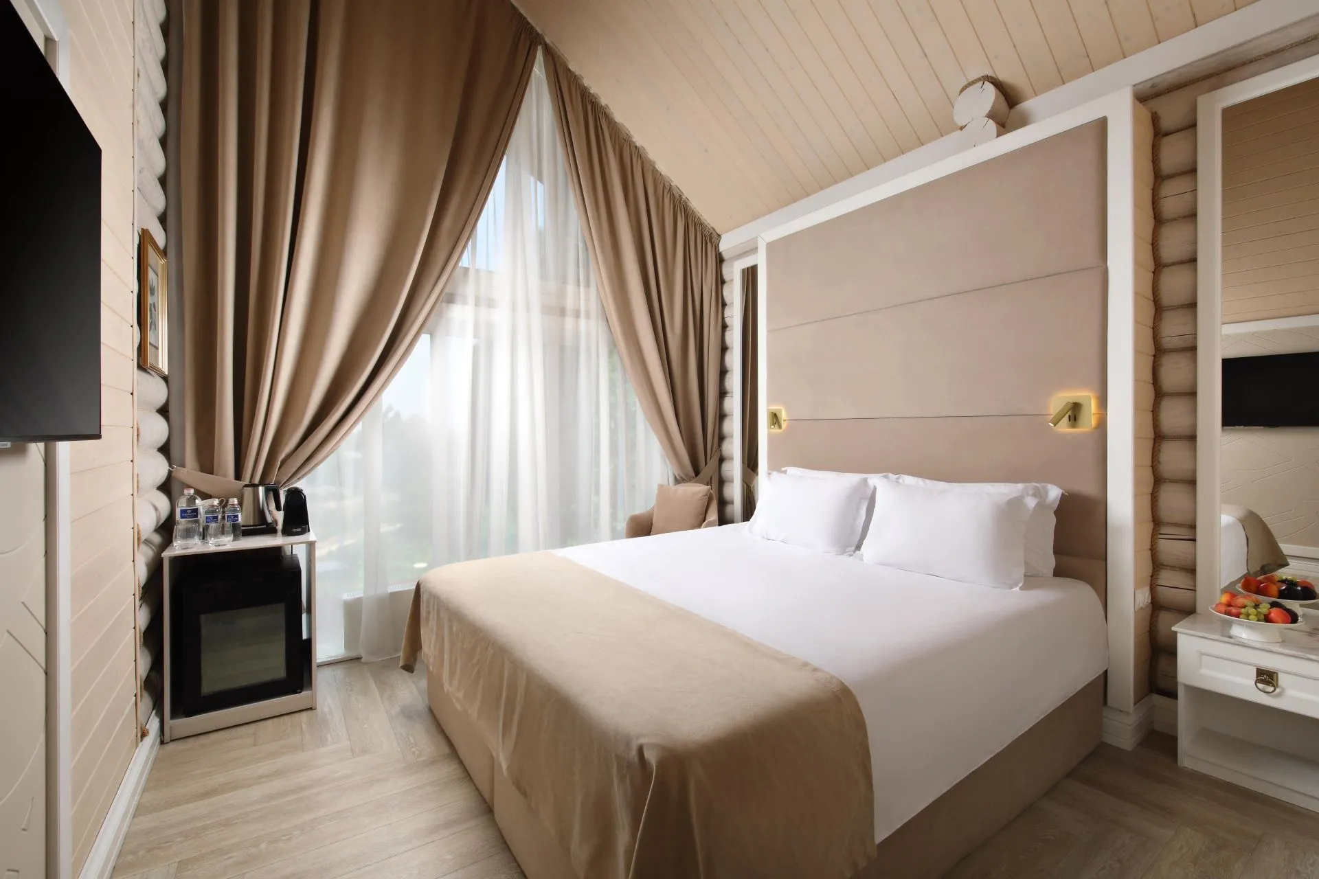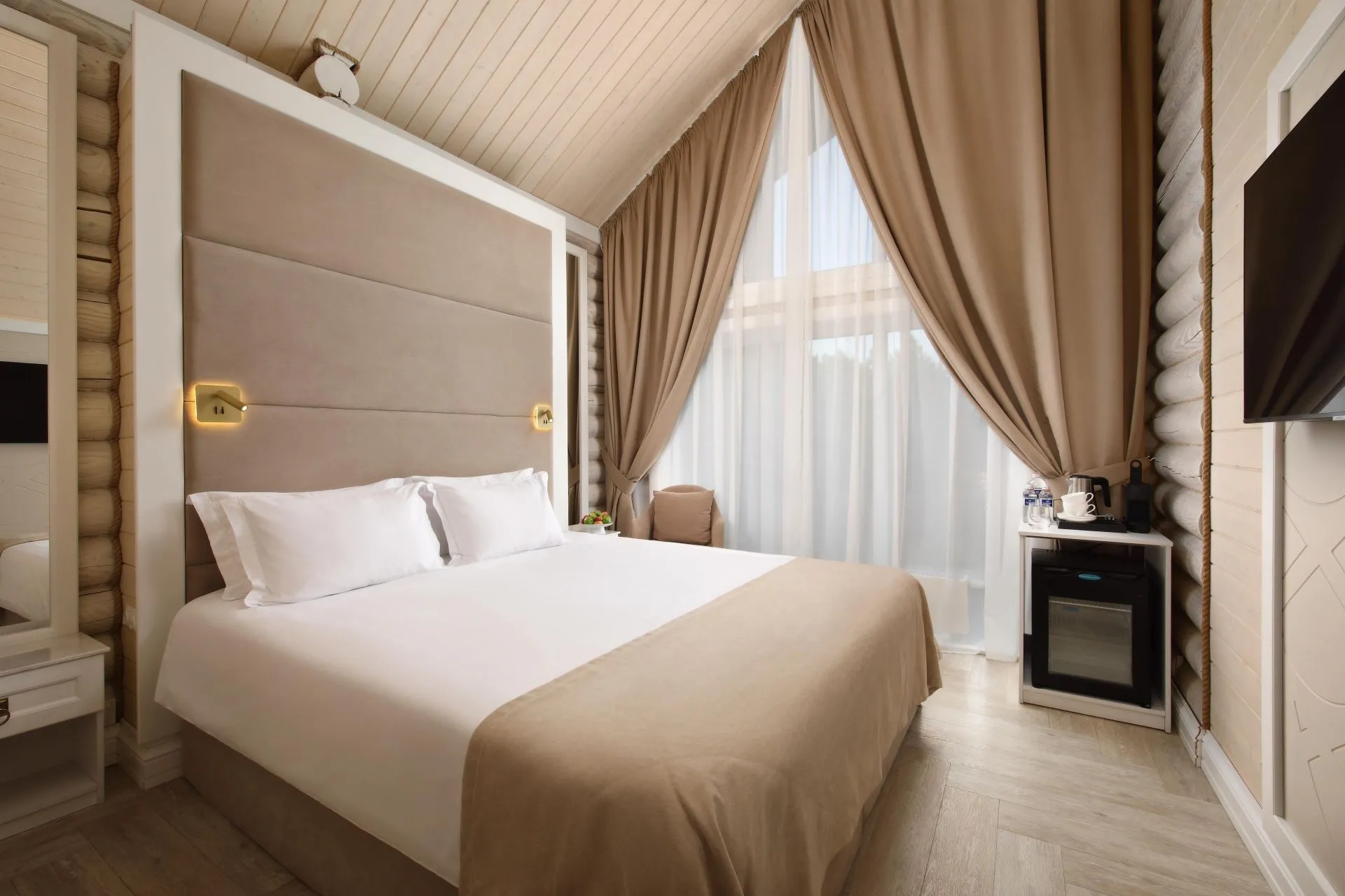 The ideal choice for those who seek to combine uncompromising comfort with a touch of luxury. Contemporary aesthetics, exclusive accessories, pleasant colors and a stunning view of the forest. De Luxe category room - created for discerning guests who value comfort and convenience, space and sophistication.